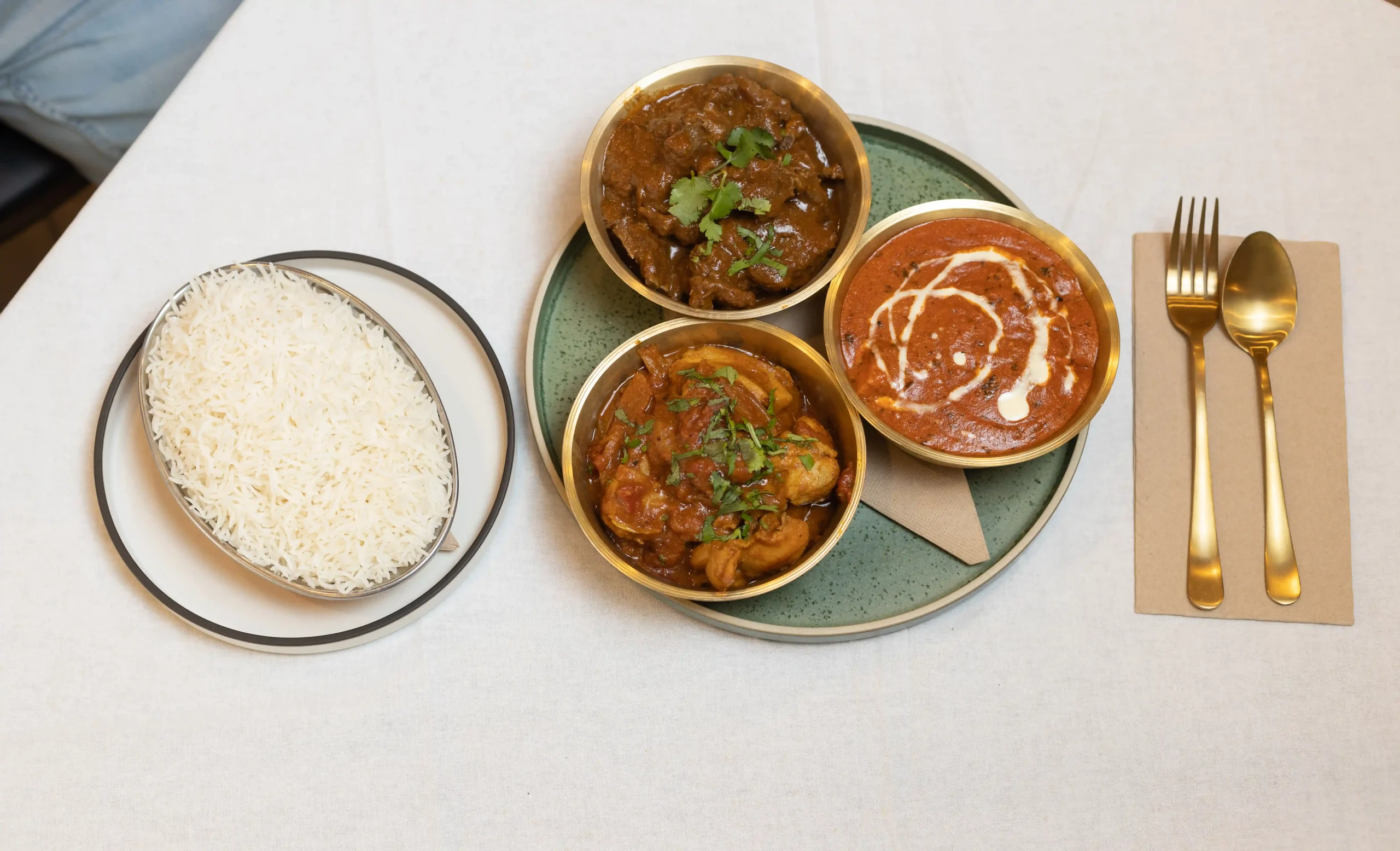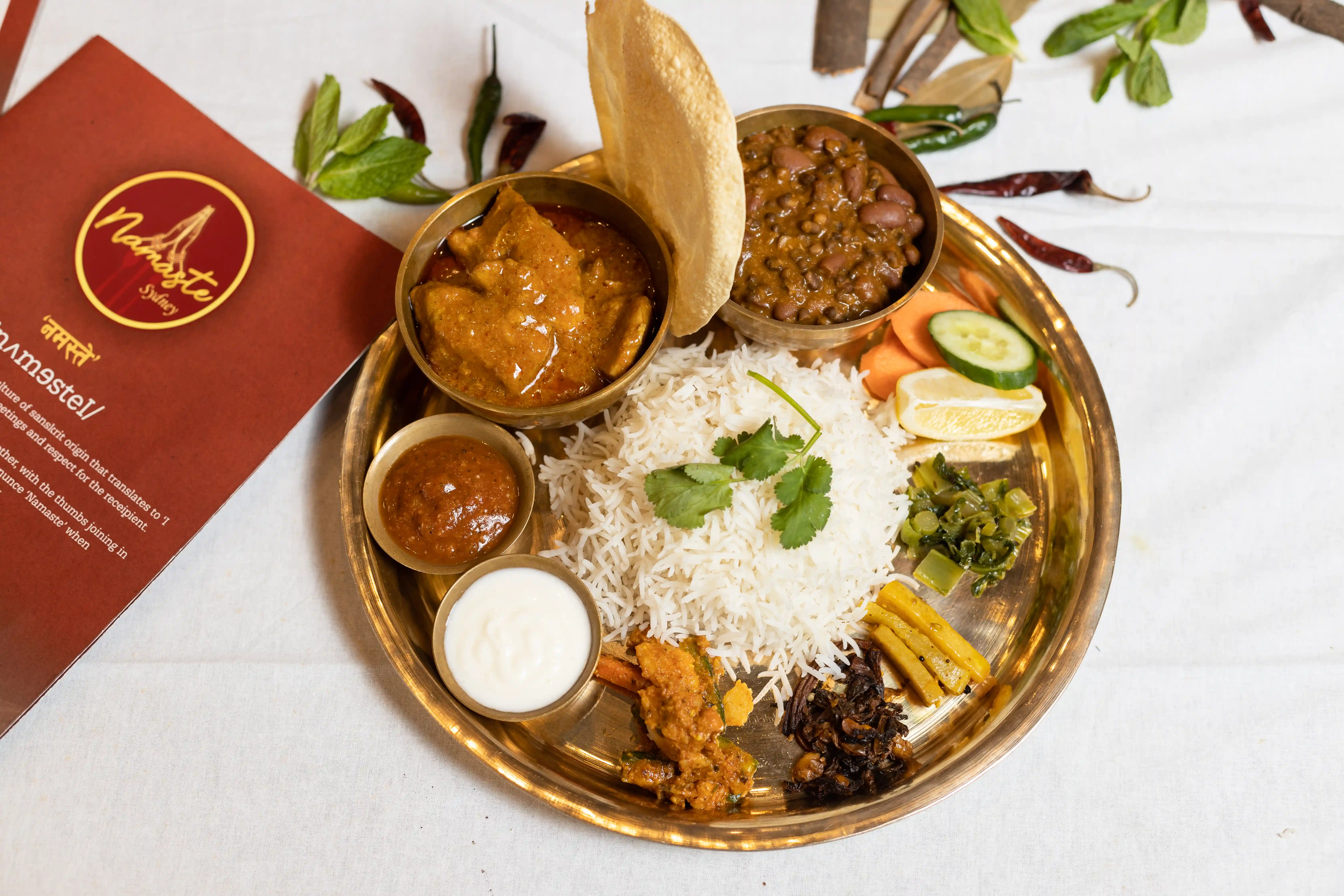 Namaste thali set black lentil dal, basmati rice, potato achar, salad, sweet yoghurt and tomato chutney.