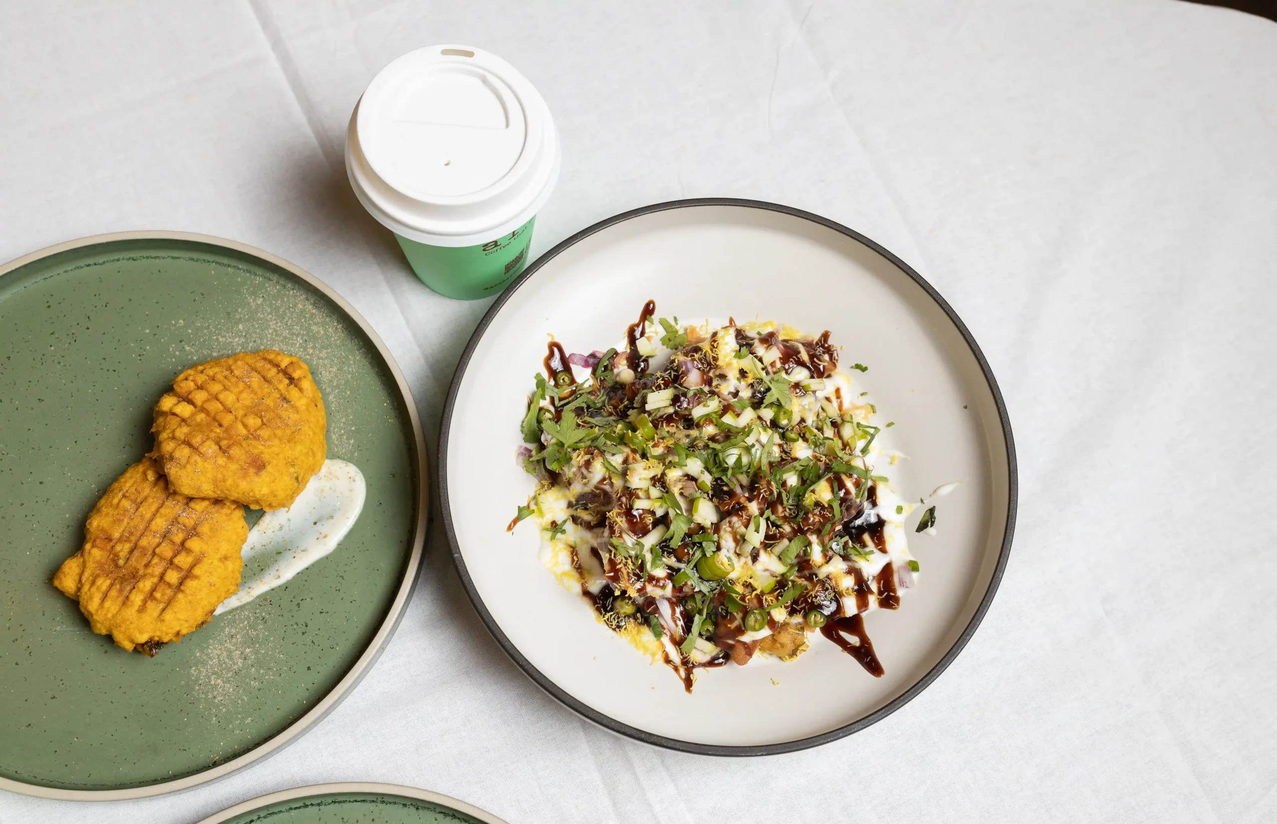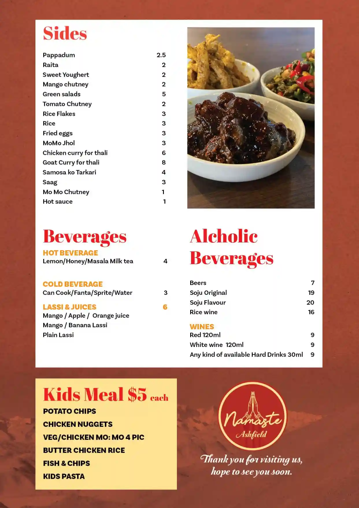 Namaste thali set black lentil dal, basmati rice, potato achar, salad, sweet yoghurt and tomato chutney.